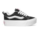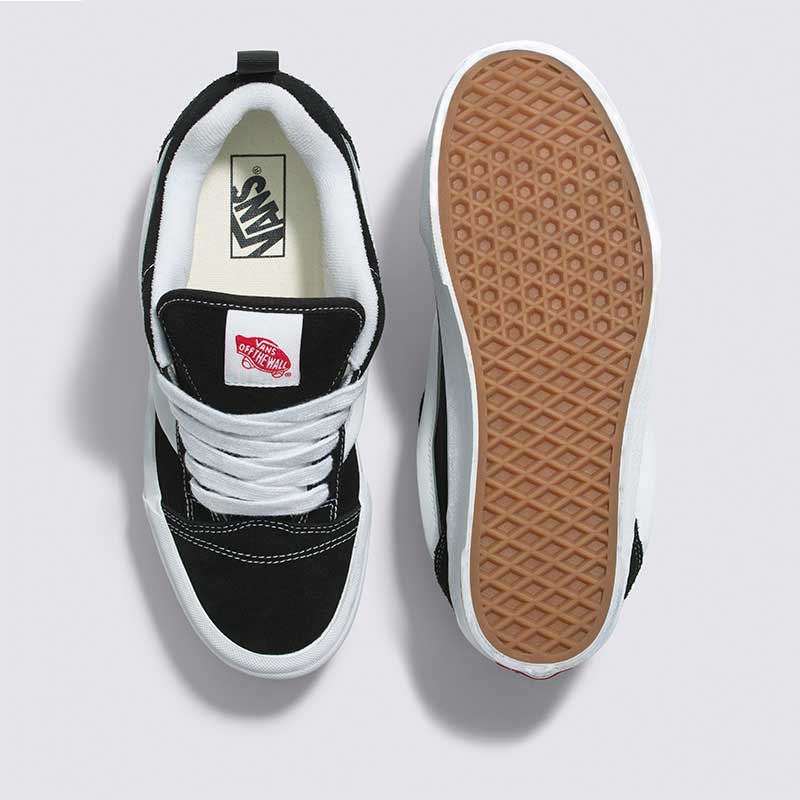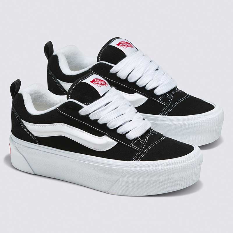 Los Championes Vans Knu Stack color negro elevan el estilo hinchado de los 90 con una silueta de perfil bajo y una plataforma de 34 mm que potencia su estética audaz. Confeccionadas en gamuza resistente, presentan una lengüeta abultada, cuello acolchado y el icónico Sidestripe blanco moldeado en 3D que refuerza su identidad retro. Los cordones gruesos y la suela waffle de goma distintiva completan un diseño llamativo que fusiona herencia y tendencia en un solo paso.