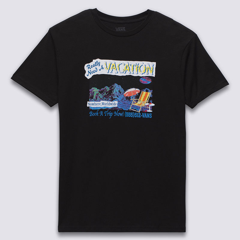 Tómate un descanso con la remera Need a Vacation, una camiseta de manga corta y cuello redondo de corte clásico, con gráficos impresos en la parte trasera que simulan un anuncio retro de vacaciones al estilo Vans®.