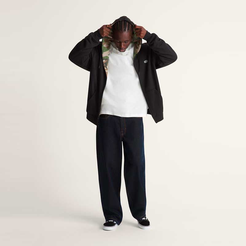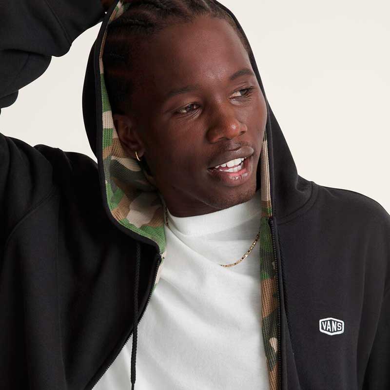 Enfréntate a los elementos con la sudadera con capucha Dover Thermal Zip, que cuenta con forro térmico que reduce la transferencia de calor y te mantiene abrigado. Con un interior con estampado de camuflaje y un exterior negro intenso, la cremallera frontal completa ofrece gran adaptabilidad, mientras que el logotipo bordado de Vans añade detalles de primera calidad.