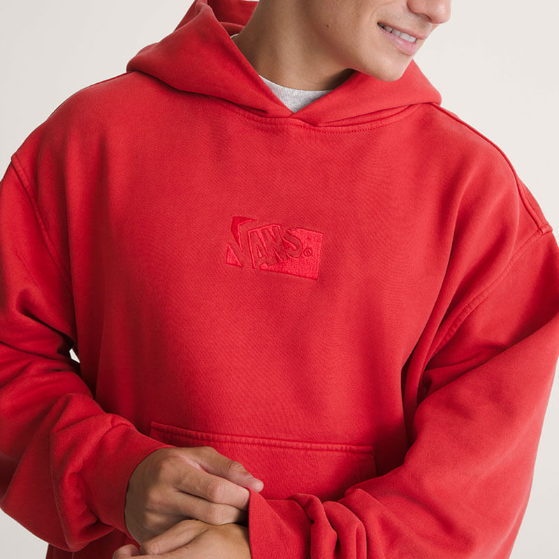 Canguro Vans original LX Pullover Rojo. Confeccionado en polar pesado, ofrece abrigo y comodidad para el uso diario. Presenta ajuste holgado que facilita el movimiento, interior cepillado suave al tacto y bolsillo tipo canguro funcional para llevar objetos o mantener las manos abrigadas. La capucha con cordón permite regular el calce, mientras que el bordado tonal suma un detalle sutil. Composición: 70% algodón y 30% poliéster.